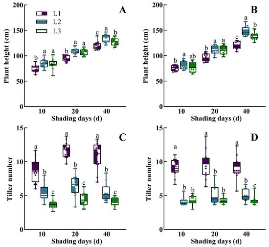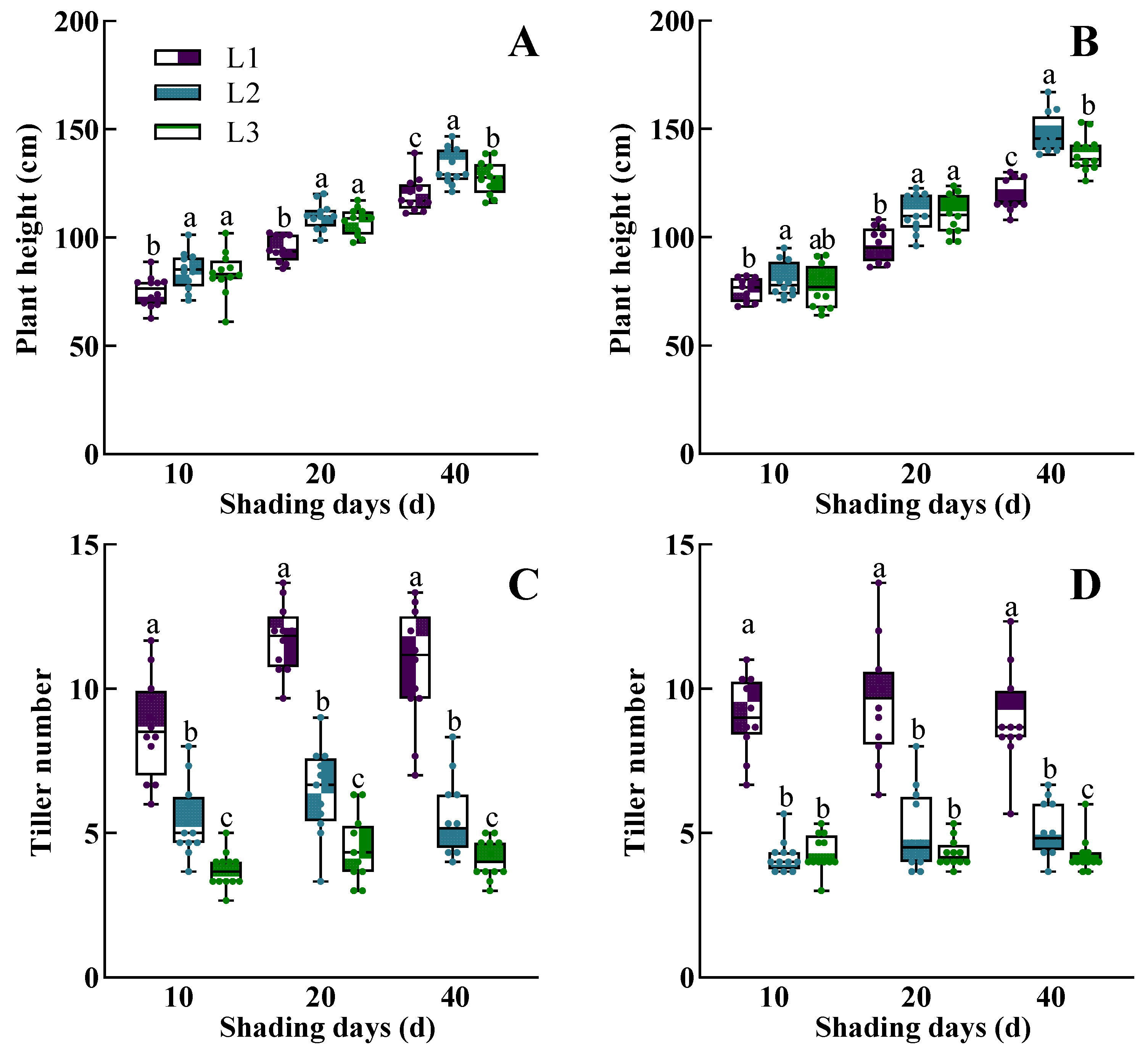 Figure 2. Differences in plant height and tiller number of rice under different light conditions. (A) Plant height in 2021; (B) plant height in 2022; (C) tiller number in 2021; and (D) tiller number in 2022. L1, L2, and L3 represent natural light, 50% shading, and 75% shading, respectively. Different lowercase letters indicate significant differences among different light treatments at the same time period. Each point within the box represents the mean of the parameters in each cultivar (n = 3 subplots) under different light treatments.