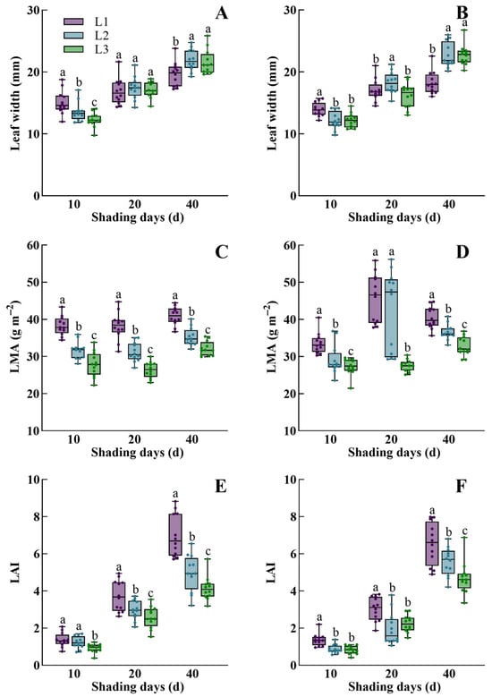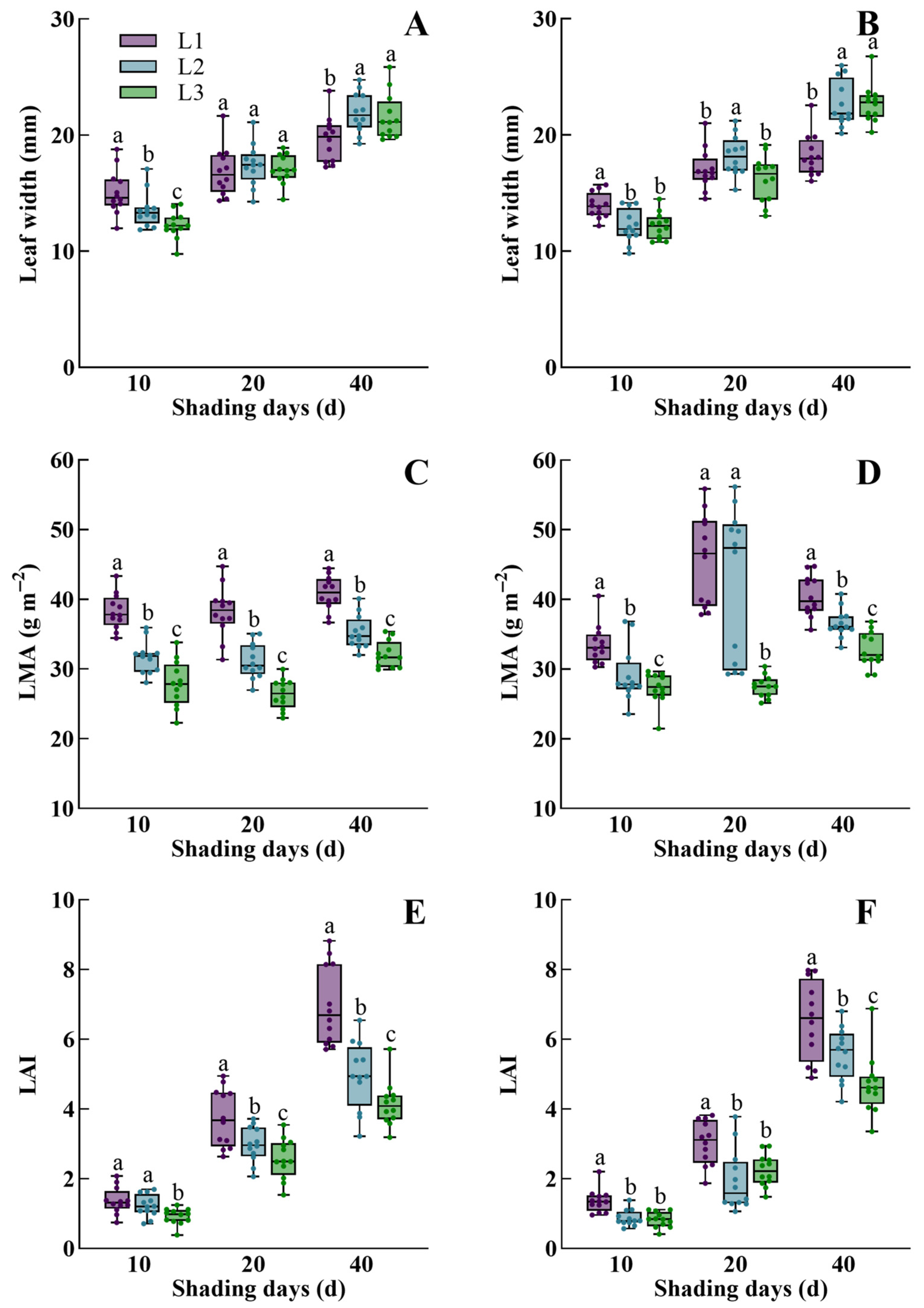 Figure 3. Differences in leaf width, LMA, and LAI under different light conditions. LMA, Leaf mass per area; LAI, leaf area index. (A) Leaf width in 2021; (B) leaf width in 2022; (C) LMA in 2021; (D) LMA in 2022; (E) LAI in 2021; and (F) LAI in 2022. L1, L2, and L3 represent natural light, 50% shading, and 75% shading, respectively. Different lowercase letters indicate significant differences among different light treatments at the same time period. Each point within the box represents the mean of the parameters in each cultivar (n = 3 subplots) under different light treatments.