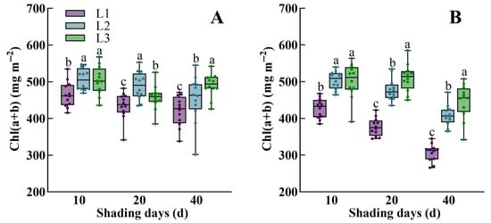 Figure 4. Differences in Chl(a + b) under different light conditions. (A) Chl(a + b) in 2021; (B) Chl(a + b) in 2022. L1, L2, and L3 represent natural light, 50% shading, and 75% shading, respectively. Different lowercase letters indicate significant differences among different light treatments at the same time period. Each point within the box represents the mean of the parameters in each cultivar (n = 3 subplots) under different light treatments.
