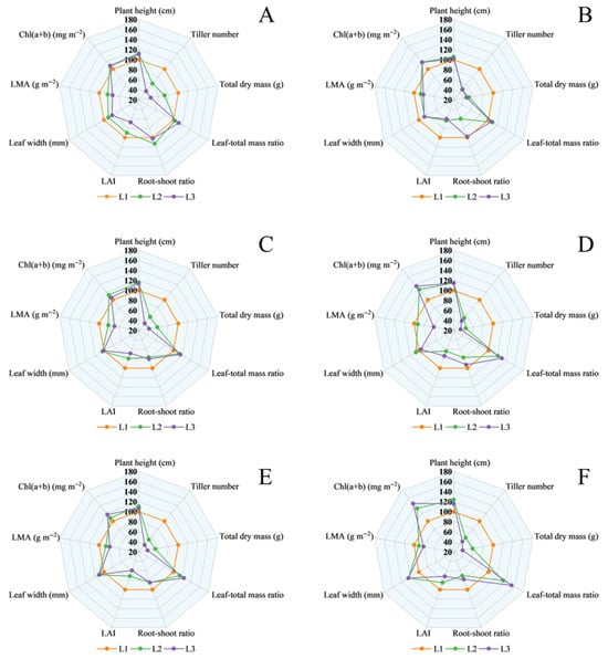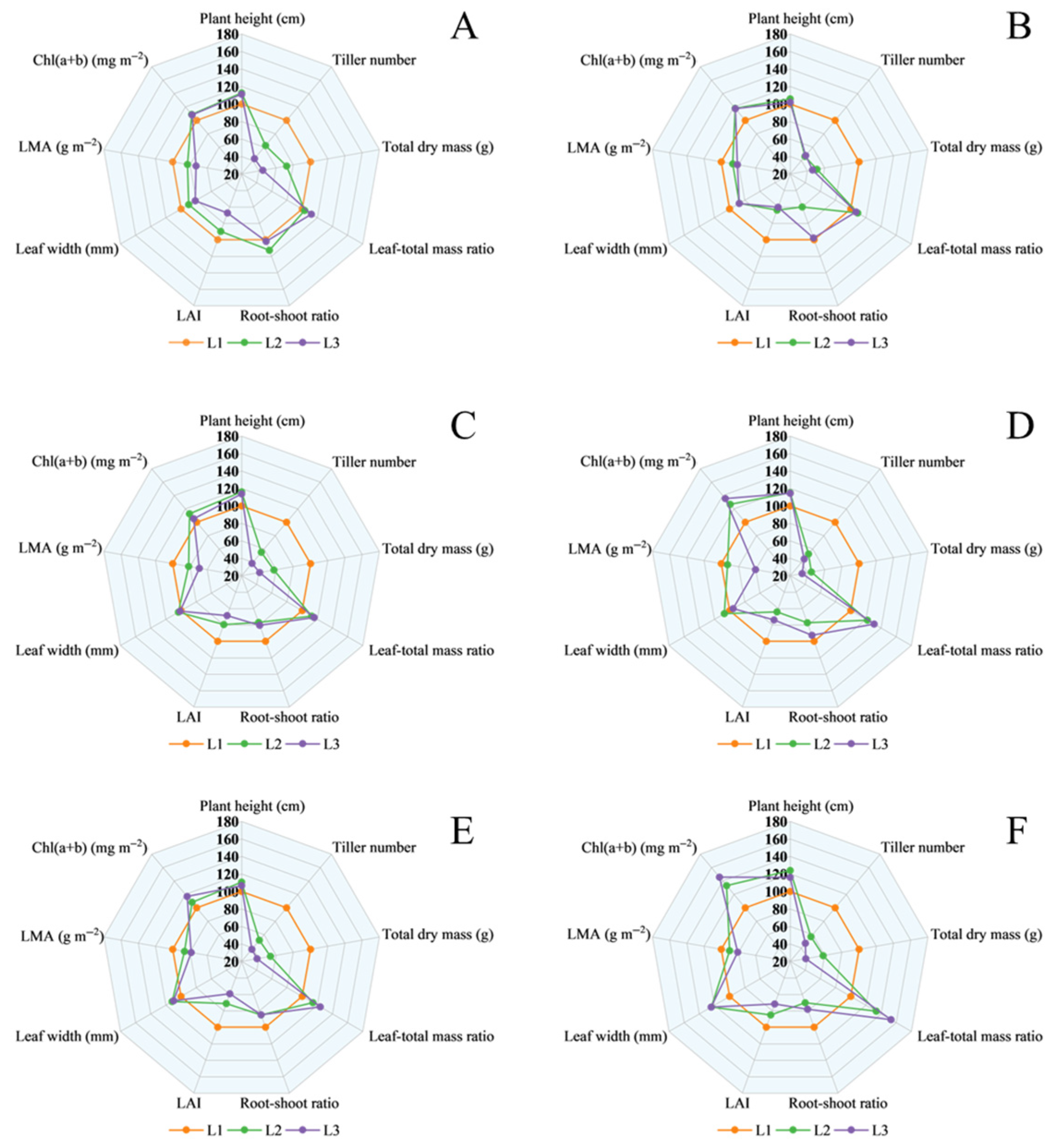 Figure 7. Shade tolerance coefficient (STC) of rice morphological characteristics and physiological properties. (A) STC after shading for 10 days in 2021; (B) STC after shading for 10 days in 2022; (C) STC after shading for 20 days in 2021; (D) STC after shading for 20 days in 2022; (E) STC after shading for 40 days in 2021; and (F) STC after shading for 40 days in 2022. L1, L2, and L3 represent natural light, 50% shading, and 75% shading, respectively. Values are means across all twelve cultivars (n = 36 subplots = 12 cultivars × 3 replicates).