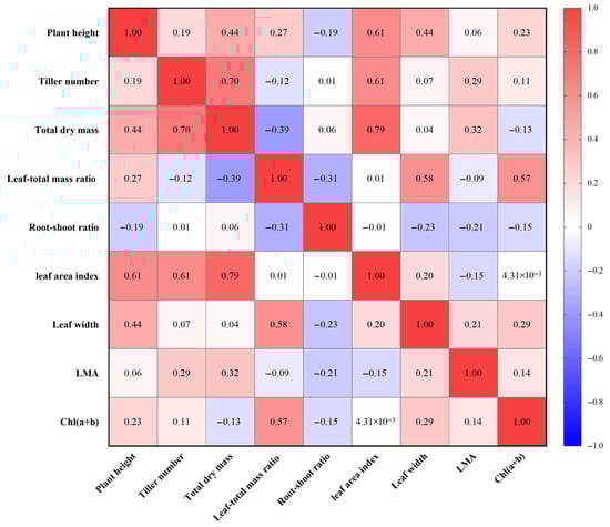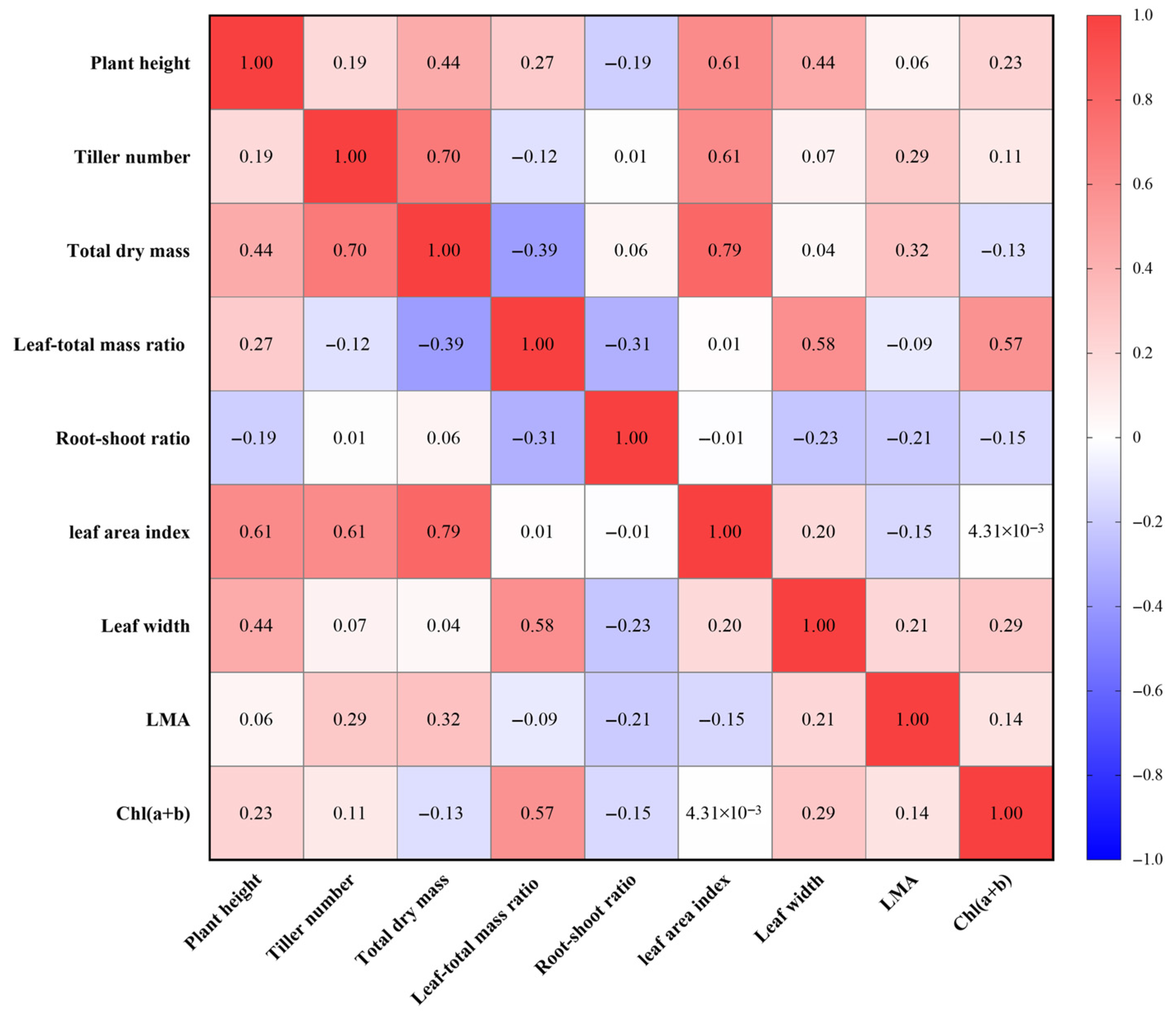 Plant height and tiller number were recorded for all sampled plants within the experimental plots. The first fully expanded leaf from the top of each plant was taken, and four segments were cut from the central part of the blade. Two segments were used to determine leaf mass per area (LMA) and the other two for pigment content. The leaf width was measured at the widest part with the vernier caliper. After drying at 85 °C to constant weight, LMA was computed as the ratio of dry mass to segment area: