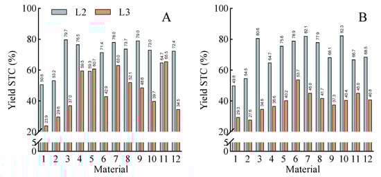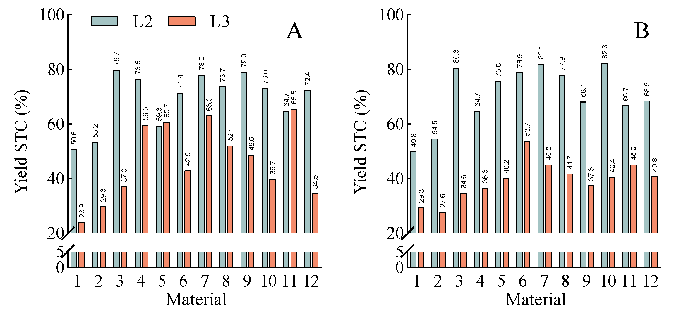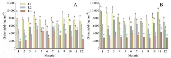 In this study, there were differences in yield STC among rice cultivars (Figure 12). Through a two-year field experiment, we found that under the 50% shading condition, the majority of tested rice cultivars had STCs exceeding 60%. Under the 75% shading condition, the rice cultivars with STCs greater than 40% in 2021 were numbers 4, 5, 6, 7, 8, 9, and 11, while in 2022, they were numbers 5, 6, 7, 8, 10, 11, and 12. Cultivars 1 and 2 exhibited relatively low STCs under both the 50% and 75% shading conditions. Further analysis was conducted on the actual yield of different rice cultivars under different light conditions. The results indicated that rice yield decreased significantly as the light intensity decreased (Figure 13). In 2021, the yield ranges of rice under L1, L2, and L3 treatments were 6346–8681 kg hm−2, 4037–6642 kg hm−2, and 1904–5167 kg hm−2, respectively. Under the L2 treatment, rice cultivars with material numbers 3, 4, 7, 9, and 10 exhibited relatively higher yields. Under the L3 treatment in 2021, cultivars with material numbers 4, 5, 7, and 11 achieved higher yield levels (Figure 13A). In 2022, the yield ranges of rice under L1, L2, and L3 treatments were 7034–9776 kg hm−2, 4816–7600 kg hm−2, and 2611–4348 kg hm−2, respectively. Under the L2 treatment, cultivars 3, 6, 7, 10, and 11 demonstrated superior yield performance. Under the L3 treatment, cultivars 6, 7, and 11 exhibited notably higher yields (Figure 13B, Table A2).