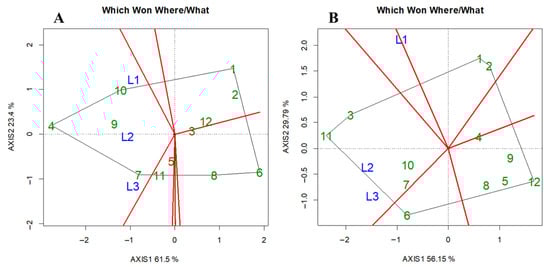 Figure 14. Acclimatization of cultivars in different light environments based on a GGE biplot. (A) Acclimatization of cultivars in 2021; (B) acclimatization of cultivars in 2022. The biplot is based on environment-centered (Centering = 2) and scaled data (Scaling = 1), using a genotype-focused singular value partitioning (SVP = 1) method. PC1 and PC2 collectively explain 84.9% (2021) and 85.9% (2022) of the total G + GE variance, supporting the reliability of the results. L1, L2, and L3 represent natural light, 50% shading, and 75% shading, respectively. Cultivar codes: 1 (Zhong 9 You 804), 2 (Xida 8 You 727), 3 (Gang You 952), 4 (Rong You 184), 5 (Jia You 968), 6 (Zhong You 596), 7 (Le You 918), 8 (Q You 12), 9 (Yuxiang 203), 10 (Chuankang You 65), 11 (Shen 9 You 28), and 12 (II You 602).