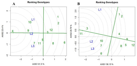 Figure 15. Ranking of genotypes by yield and stability of cultivars in different light environments based on a GGE biplot. (A) Ranking of genotypes in 2021; (B) ranking of genotypes in 2022. The biplot is based on environment-centered (Centering = 2) and scaled data (Scaling = 1), using a genotype-focused singular value partitioning (SVP = 1) method. PC1 and PC2 collectively explain 84.9% (2021) and 85.9% (2022) of the total G + GE variance, supporting the reliability of the results. L1, L2, and L3 represent natural light, 50% shading, and 75% shading, respectively. Cultivar codes: 1 (Zhong 9 You 804), 2 (Xida 8 You 727), 3 (Gang You 952), 4 (Rong You 184), 5 (Jia You 968), 6 (Zhong You 596), 7 (Le You 918), 8 (Q You 12), 9 (Yuxiang 203), 10 (Chuankang You 65), 11 (Shen 9 You 28), and 12 (II You 602).