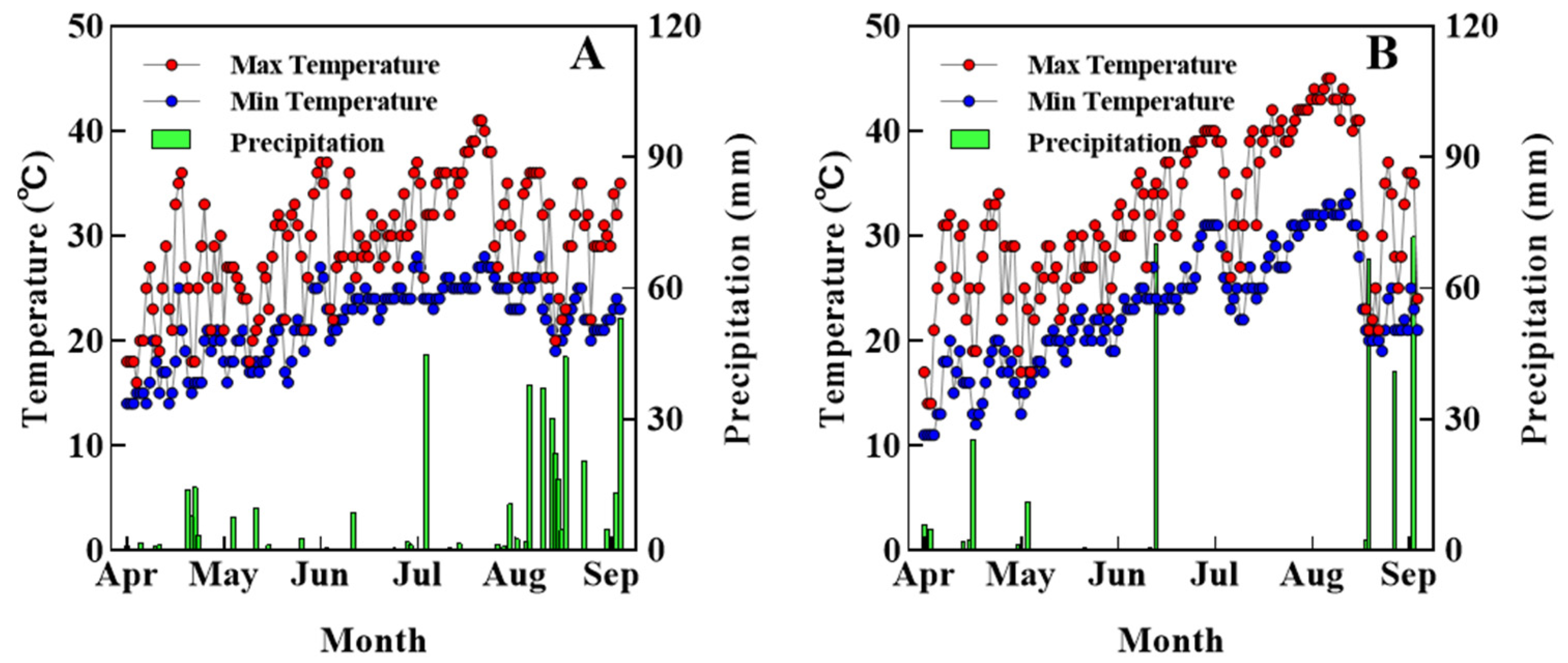 Figure 1. Meteorological data on daily maximum and minimum temperatures and precipitation at the experimental site in 2021 and 2022. (A) Meteorological data in 2021; (B) meteorological data in 2022.