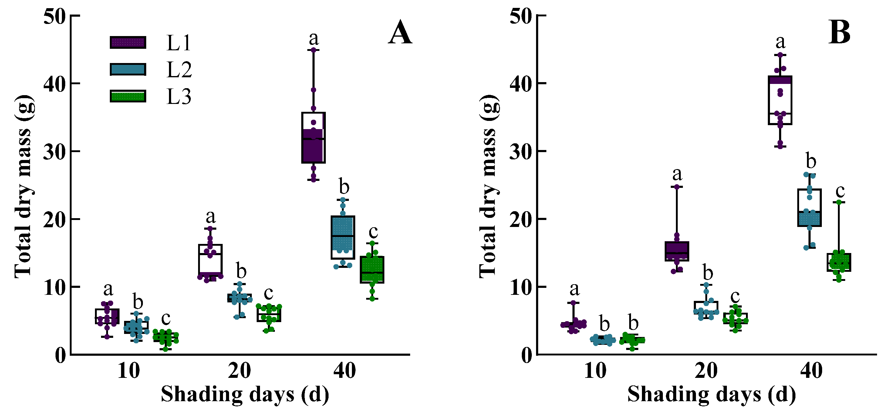 Figure 5. Differences in the total dry mass of rice under different light conditions. (A) Total dry mass in 2021; (B) total dry mass in 2022. L1, L2, and L3 represent natural light, 50% shading, and 75% shading, respectively. Different lowercase letters indicate significant differences among different light treatments at the same time period. Each point within the box represents the mean of the parameters in each cultivar (n = 3 subplots) under different light treatments.