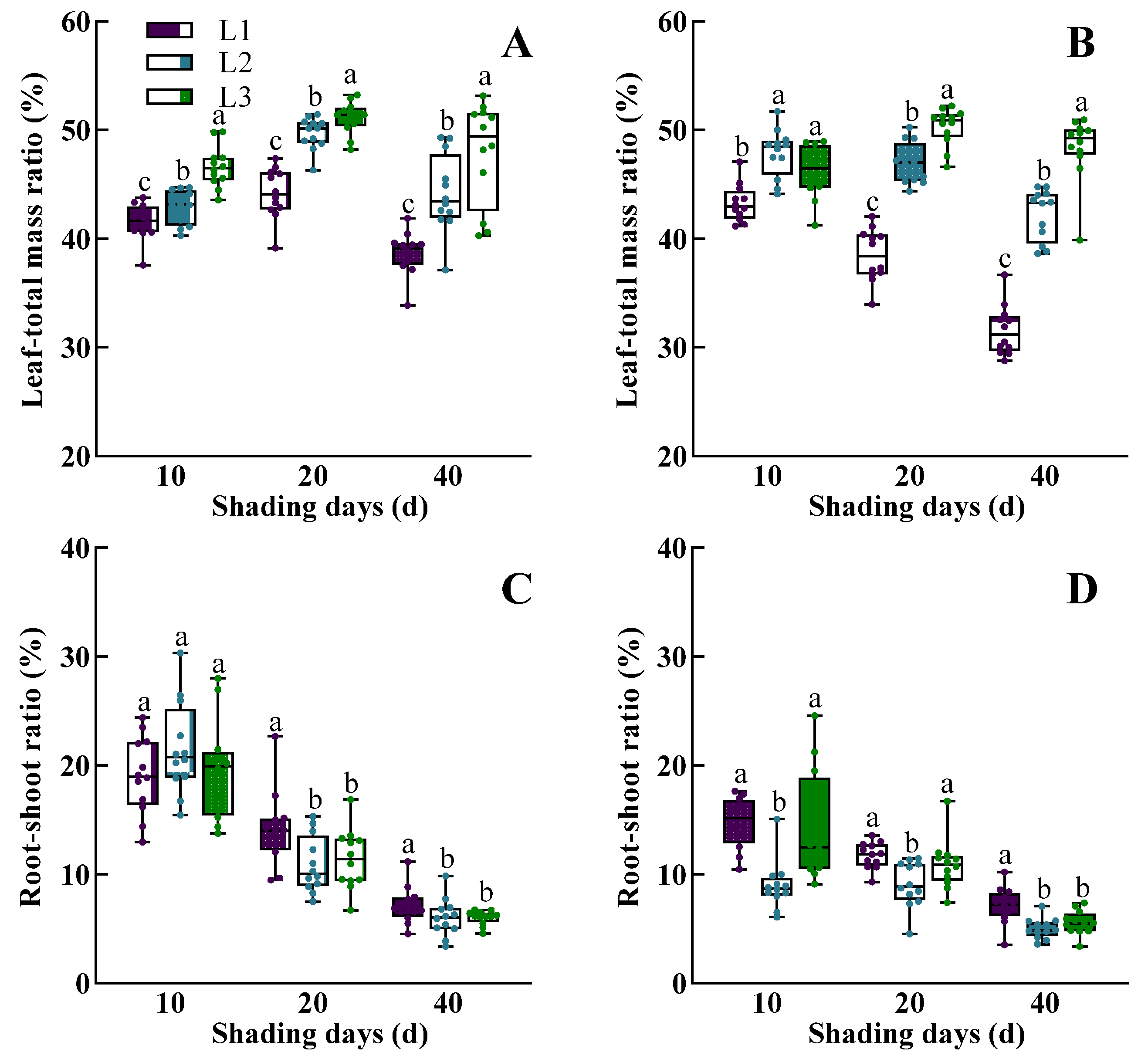 Figure 6. Differences in the leaf-total mass ratio and root-shoot ratio of rice under different light conditions. (A) Leaf-total mass ratio in 2021; (B) leaf-total mass ratio in 2022; (C) root-shoot ratio in 2021; and (D) root-shoot ratio in 2022. L1, L2, and L3 represent natural light, 50% shading, and 75% shading, respectively. Different lowercase letters indicate significant differences among different light treatments at the same time period. Each point within the box represents the mean of the parameters in each cultivar (n = 3 subplots) under different light treatments.