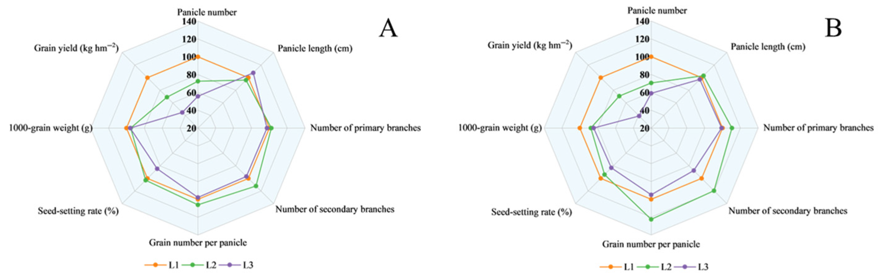 Figure 8. Shade tolerance coefficient of rice yield traits. (A) Shade tolerance coefficient in 2021; (B) shade tolerance coefficient in 2022. L1, L2, and L3 represent natural light, 50% shading, and 75% shading, respectively. Values are means across all twelve cultivars (n = 36 subplots = 12 cultivars × 3 replicates).