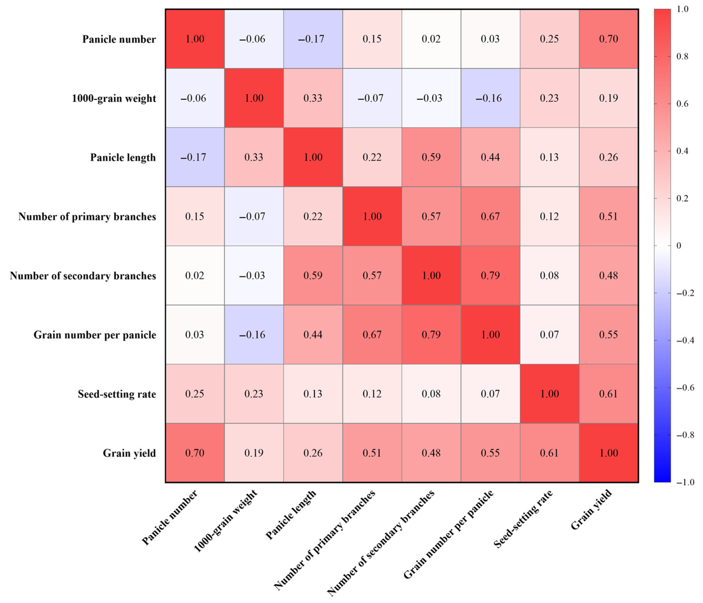 Five plants per plot were used for yield component evaluation, including panicle number, panicle length, number of primary branches, number of secondary branches, grain number per panicle, seed-setting rate, 1000-grain weight, and yield.