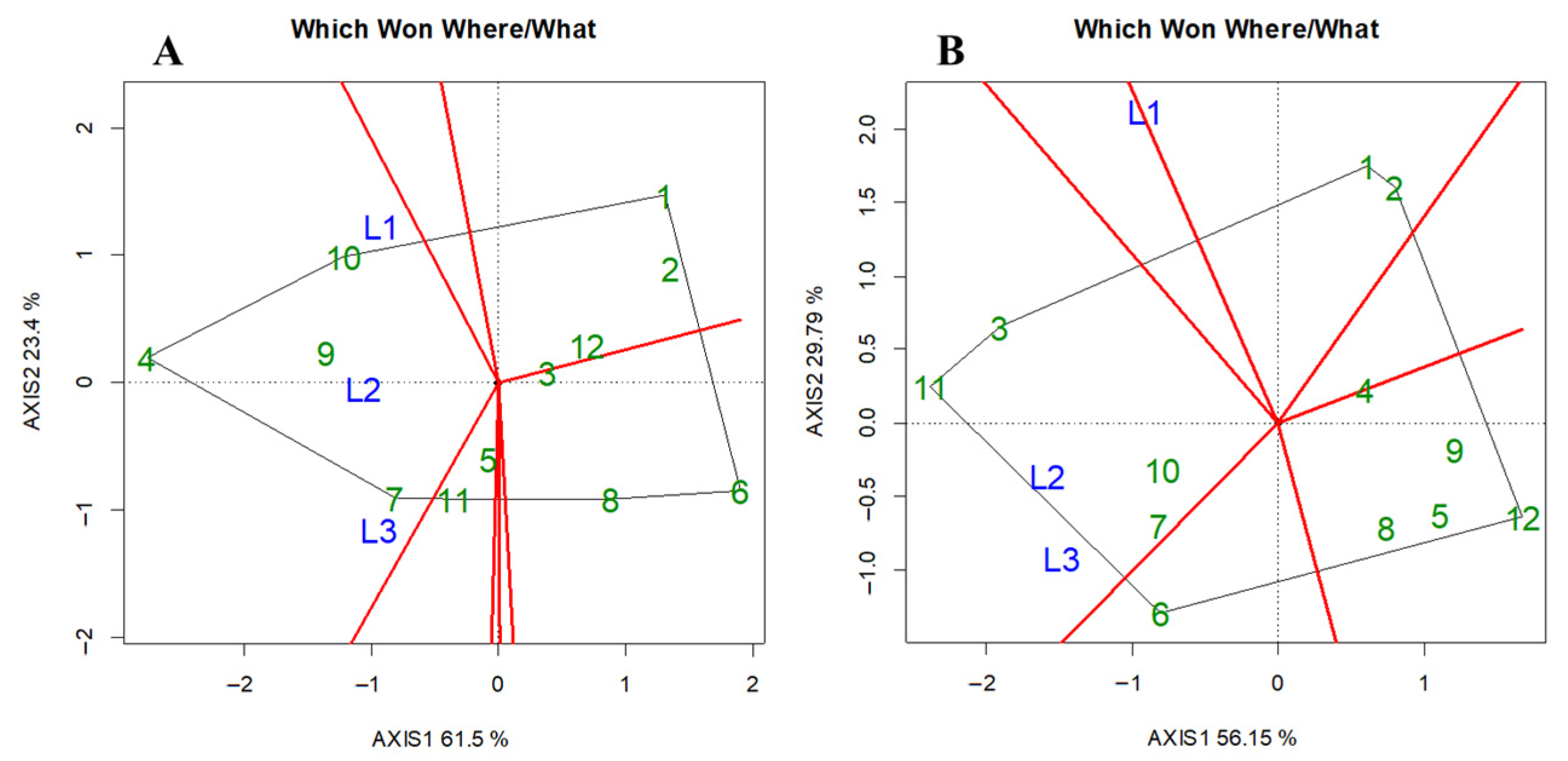 30. Saeidnia, F.; Taherian, M.; Nazeri, S. Graphical analysis of multi-environmental trials for wheat grain yield based on GGE-biplot analysis under diverse sowing dates. BMC Plant Biol. 2023, 23, 198. [Google Scholar] [CrossRef] [PubMed]