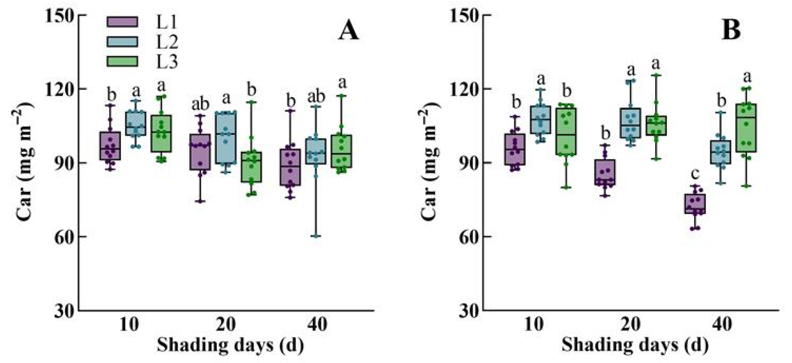 Shading significantly affected the physiological traits of rice, particularly the leaf chlorophyll content (Figure 4). After 10 days of shading, the chlorophyll content (Chl(a + b)) increased significantly, with no significant differences observed between L2 and L3 treatments. After 40 days of shading, the leaf chlorophyll content showed significant differences among treatments, in the order of L2 > L3 > L1. The Car content increased significantly under shading, following the same upward trend as Chl(a + b) (Figure A1).