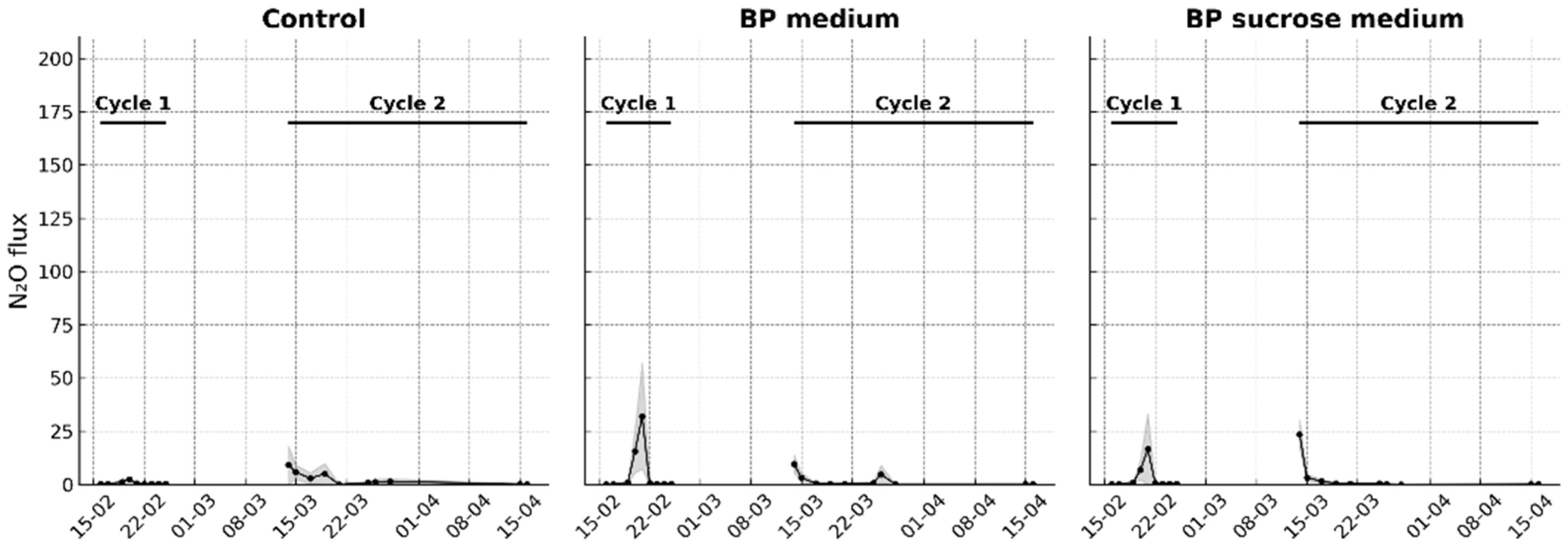 For each sampling date, N2O flux observations were available as replicate measurements within each treatment. For every treatment, we computed the arithmetic mean and the standard error of the mean (SEM). The predefined gap between cycles (no samples collected) was excluded from calculations.