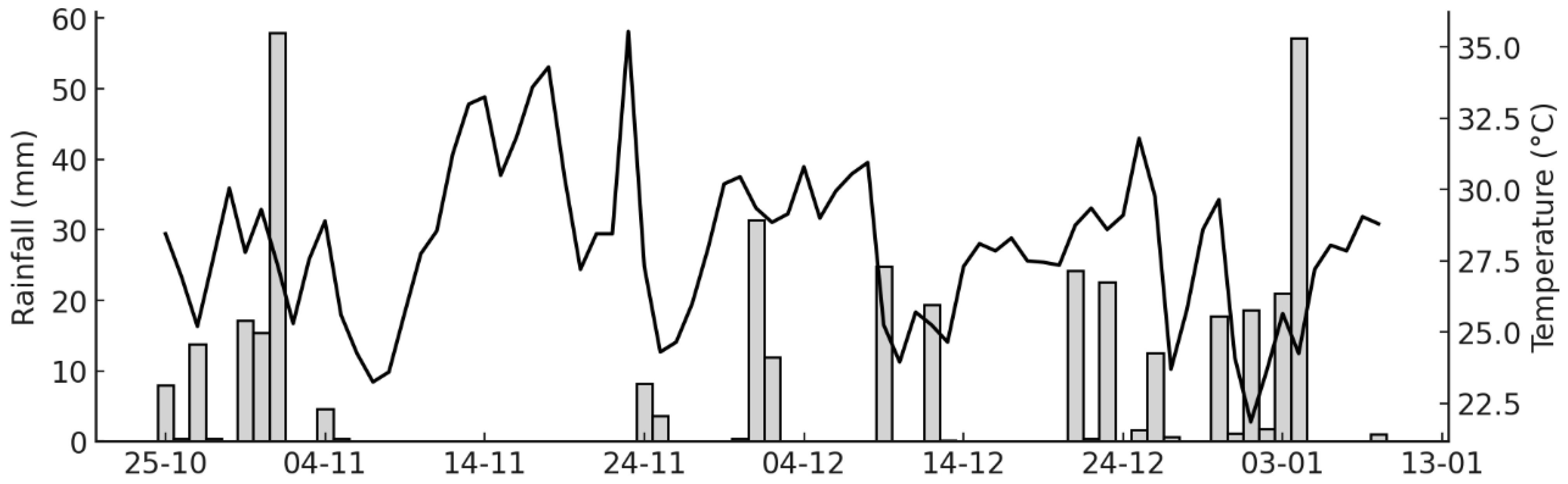 This second experiment was carried out as a field trial in an experimental area of the Fluminense Federal Institute of Education, Science and Technology (IFF), in Bom Jesus de Itabapoana, Rio de Janeiro State. The city lies in the northwestern region of the State, at 21°08′02″ S and 41°40′47″ W, at an altitude of 88 m, with an Aw climate (tropical savanna, sub-humid to dry). The mean annual temperature ranges from 22 to 25 °C, and mean annual precipitation is 1200–1300 mm. The soil in the area was relatively flat and presented a loamy texture being classified as an Oxisol. Soil samples collected from the 0–20 cm layer showed the following chemical properties prior to experimental setup: pHH2O 5.02; Al3+ 0.25 cmolc dm−3; H + Al 3.50 cmolc dm−3; Ca2+ 2.14 cmolc dm−3; Mg+2 0.89 cmolc dm−3; K+ 32.3 mg dm−3; P (Mehlich I) 4.12 mg dm−3. A meteorological station at the Institute continuously recorded daily rainfall and air temperature data, which was the data source for the field experiment.