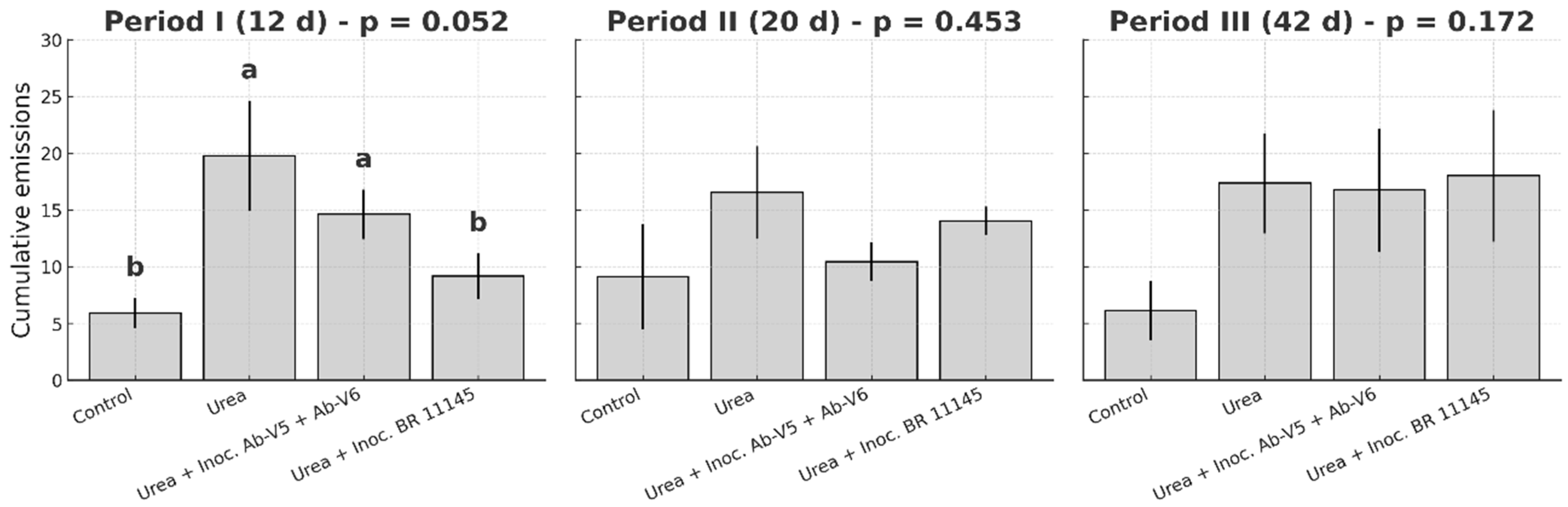 2O emission factors when compared with non-inoculated treatments. The way EF is calculated, requiring integration of emissions over the entire crop cycle, substantially increases variability, which likely masked statistically significant differences among treatments. Despite this, the temporal emission patterns clearly indicated a mitigation effect, which was not fully captured by the cumulative EF metric even though an apparent 15% reduction was estimated with the use of both inoculants. This is far from the N