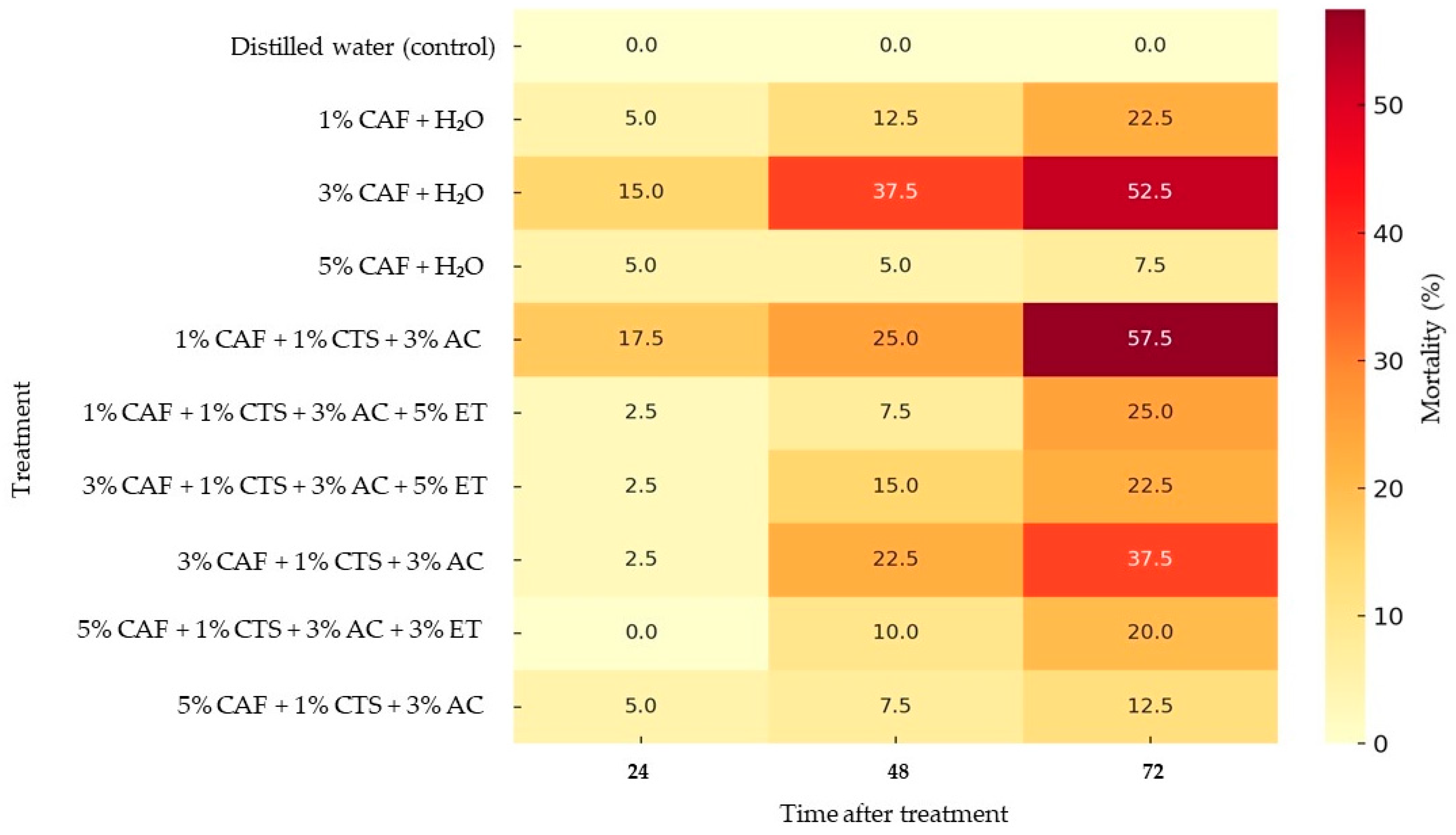 | 3% CAF + 1% CTS + 3% AC | 2.5 ± 2.5 ns | 22.5 ± 6.3 ab | 37.5 ± 4.8 abc | 0.0–13.3 | 0.0–47.6 | 16.8–58.2 |