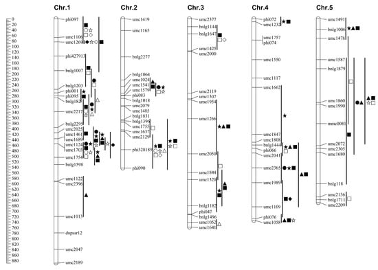 - Cai, H.; Chu, Q.; Yuan, L.; Liu, J.; Chen, X.; Chen, F.; Mi, G.; Zhang, F. Identification of quantitative trait loci for leaf area and chlorophyll content in maize (Zea mays) under low nitrogen and low phosphorus supply. Mol. Breed. 2012, 30, 251–266. [Google Scholar] [CrossRef]