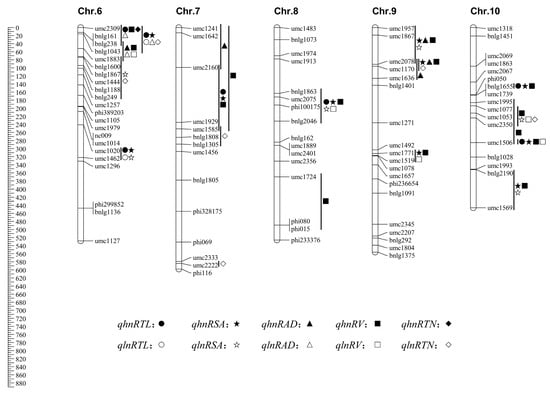 Chromosomal locations of quantitative trait loci (QTLs) for maize seedling root traits identified under high-nitrogen (HN) and low-nitrogen (LN) conditions. QTLs for different traits are represented by distinct symbols, as indicated in the figure legend. The chromosomal positions of QTLs are shown to the right of each chromosome, with HN-specific and LN-specific QTLs highlighted in different colors for clarity. Important QTL clusters mentioned in the text are annotated. Genetic markers and their corresponding bin locations are displayed to the left of the chromosomes. The figure illustrates the distribution of nitrogen condition-specific and stably expressed QTLs across the maize genome.