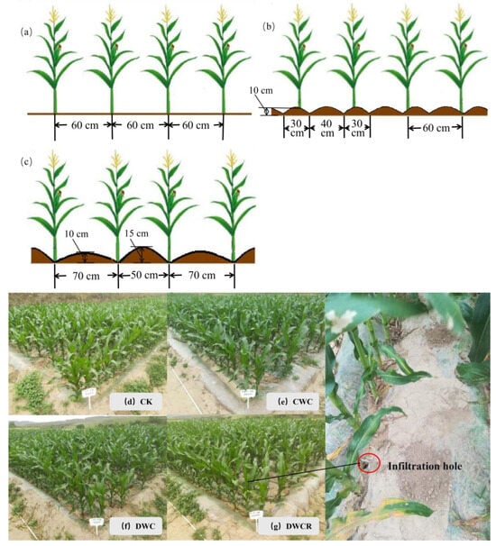 Diagram of different ridging planting methods. CK, conventional flat planting (a,d); CWC, a traditional ridge-furrow system (b,e); DWC, a double ridge-furrow system (c,f); DWCR, the double ridge-furrow system with infiltration holes (g).