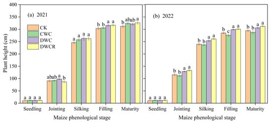 Dynamic variation in plant height of maize during two growing seasons. Values are mean ± SE (n = 5). Different lowercase letters indicate significant differences among treatments at p < 0.05 according to Tukey’s HSD test.