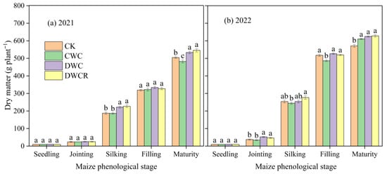 Dynamic variation in dry matter accumulation of maize across two growing seasons. Values are mean ± SE (n = 3). Different lowercase letters indicate significant differences among treatments at p < 0.05 according to Tukey’s HSD test.