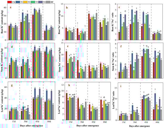 Changes of potassium (K+) content, sodium (Na+) content, and K+/Na+ ratio in the roots (a–c), stems (d–f), and leaves (g–i) of rapeseed plants on day 15 (n = 3), 30 (n = 3), 45 (n = 3), and 60 (n = 3) under the treatments of various combinations of organic–inorganic fertilizers and soil conditioners. Lowercase letters denote significant differences in the K+, Na+ and K+/Na+ ratio among various soil conditioner application treatments (p < 0.05); there is no significant difference in parameters with the same letters.