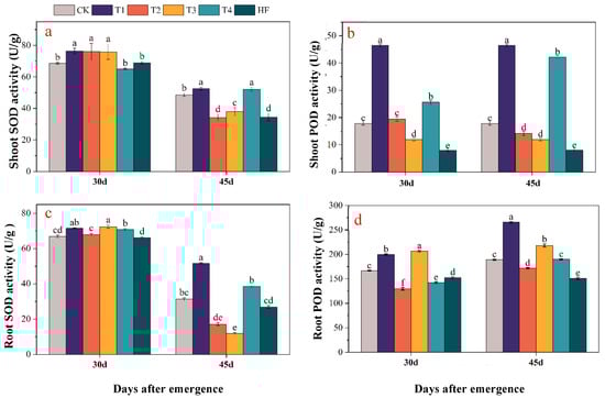 There were significant differences (p < 0.05) in superoxide dismutase (SOD) and peroxidase (POD) activities in the shoots and roots between the conditioner treatments (T1, T2, T3, T4) and CK on the 30th and 45th day (Figure 5). The activity of SOD and POD in the shoots and roots of the T1, T2, T3, and T4 treatments was higher than that of CK, with SAP (T1) showing the most significant effect (p < 0.05). The overall difference in SOD activity in the shoots and roots between the conditioner treatments and CK was small, with the root SOD activity of the T1 treatment 65.29% higher than that of CK on the 45th day. There was also a significant difference in POD activity in the shoots and roots between the conditioner treatments and CK (p < 0.05). The shoot POD activity of the T1 treatment was 161.56% and 161.58% higher than that of CK on the 30th and 45th day, respectively, and the root POD activity was 19.94% and 40.31% higher than that of CK, respectively.