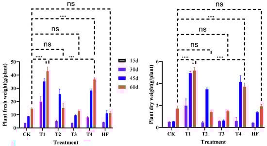 Fresh weight and dry matter accumulation of rapeseed under different treatments. ***, p < 0.001; ****, p < 0.0001; ns, insignificant difference; the error line only represents the error of each treatment.