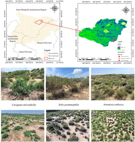 As shown in Figure 1, the study site is in the Wushen Banner, southwestern Ordos City, Inner Mongolia Autonomous Region, China. The area lies at the northern edge of the Mu Us Sandy Land and typifies a composite ecosystem of wind-blown sand, vegetation, and water resources. The study area is at an elevation of 1310–1330 m. Soils are typical sandy loam and are prone to severe wind erosion, which produces coarse soil structures. Groundwater generally occurs at depths of 3–5 m, and surface water consists mainly of seasonal rivers and lakes. The region has an arid–semi-arid temperate continental climate with pronounced diurnal temperature fluctuations. The annual average temperature is 6.0–8.5 °C, and annual precipitation is 350–400 mm, predominantly from May to August (over 75% of the annual total). Annual evaporation averages 2000–2800 mm, equivalent to 5–6 times the annual precipitation. Average annual sunshine is 2911.5 h, and the frost-free period is 123–156 d. Dominant plant species in this region include Salix matsudana, Salix psammophila, Juniperus sabina, Hippophae rhamnoides, Caragana microphylla, Artemisia ordosica, and Stipa grandis.