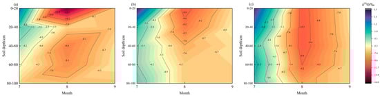 Soil-water oxygen-isotope characteristics. (a) Soil-water δ18O beneath Caragana microphylla, July–September; (b) Soil-water δ18O beneath Salix psammophila, July–September; (c) Soil-water δ18O beneath Artemisia ordosica, July–September.