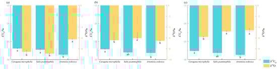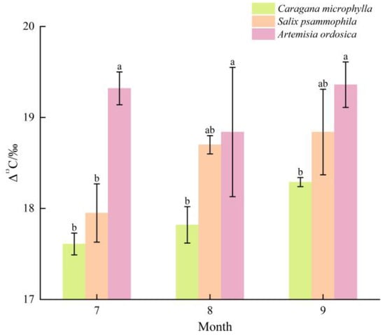 Δ13C of plant leaves (stable carbon-isotope fractionation) reflects the extent of isotopic fractionation in plant tissues relative to the atmosphere. As shown in Figure 7, in July, the 13C fractionations during CO2 fixation were ranked as follows: Artemisia ordosica (19.32‰) > Salix psammophila (17.95‰) > Caragana microphylla (17.61‰). In August, Δ13C were ranked as follows: Artemisia ordosica (18.84‰) > Salix psammophila (18.70‰) > Caragana microphylla (17.82‰). In September, 13C fractionations were ranked as follows: Artemisia ordosica (19.36‰) > Salix psammophila (18.84‰) > Caragana microphylla (18.29‰). Accordingly, Caragana microphylla exhibited the lowest 13C fractionation throughout the growth peak season.