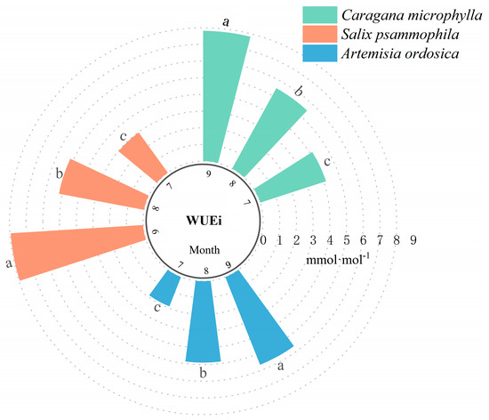 WUEi characteristics of shrubs. Different lowercase letters above bars denote significant differences in WUEi among plant species within the same month (p < 0.05).