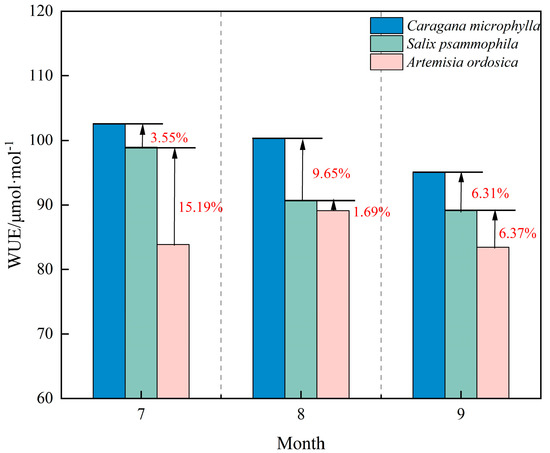 WUE is a core ecophysiological indicator integrating photosynthetic carbon fixation and water loss, directly reflecting plant carbon–water coupling. As shown in Figure 10, overall WUE ranked as Caragana microphylla > Salix psammophila > Artemisia ordosica. During the growth peak season, Caragana microphylla and Salix psammophila declined month by month, reaching troughs in September with reductions of 7.24% and 9.89%, respectively. This pattern suggests decreased Rubisco activity, with a greater decline in net photosynthetic rate than in transpiration rate [46], reflecting high responsiveness to environmental change. Artemisia ordosica showed little WUE variation across the growth peak season, following a symmetric increase-decrease pattern and peaking at 90.68 μmol·mol−1 in August.