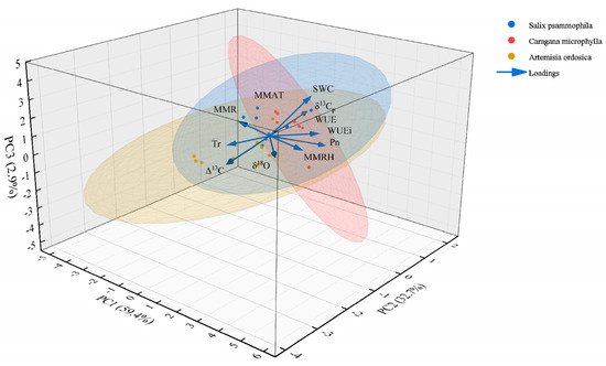 Principal Component Analysis (PCA) clarifies how environmental drivers intersect with species-intrinsic strategies to shape plant physiological patterns. As shown in Figure 11, PC1–PC3 together explained 95.08% of the total variance. Individually, PC1 = 59.43%, PC2 = 32.70%, and PC3 = 2.95%. PC1 captures the common physiological response of all species to synergistic water–heat dynamics during the growth peak season. Its gradient tracks the environmental continuum from July drought stress to improved moisture in September across the study area. This pattern aligns with Wang et al. [58], which emphasizes regional climate control over physiological rhythms and highlights the strong constraint of large-scale moisture regimes on physiological activity in sandy ecosystems. PC2 represents intrinsic differentiation in species’ water-use strategies. The three shrubs showed consistent and temporally stable positions along PC2. Caragana microphylla consistently occupied the positive end of PC2, maintaining stable Pn, elevated δ13Cp, and high WUE across the growth peak season. This configuration is consistent with a conservative strategy that combines deep-rooted access to stable water with efficient stomatal regulation [59]. However, the PC2 scores of Salix psammophila fluctuated markedly—especially after precipitation pulses—indicating a shift that prioritized growth over sustained WUE enhancement, a self-regulatory pattern consistent with an opportunistic strategy [59]. Artemisia ordosica consistently clustered at the negative end of PC2 and, in the dry month of July, simultaneously occupied low PC1 and low PC2 positions. This pattern corroborates vulnerability arising from shallow-water dependence and passive stomatal regulation, consistent with its narrow ecological niche [60].