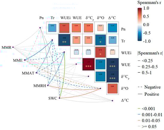 Mantel-test correlations among meteorological factors, plant photosynthetic parameters, and carbon−oxygen isotopes. The size and labels of the squares, together with the line colors, represent Spearman’s correlation coefficients. Asterisks denote significance levels: *** p < 0.001, ** p < 0.01, * p < 0.05. Dotted lines indicate negative correlations, whereas solid lines indicate positive correlations.