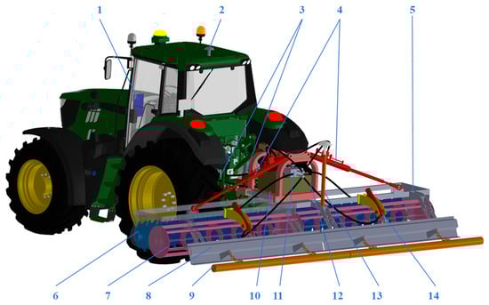 Schematic diagram of the IMPFL machine: 1: vehicle-mounted control terminal, 2: differential signal antenna, 3: left and right lifting cylinders, 4: left and right folding cylinders, 5: frame, 6: notched disc harrow, 7: slurry roller, 8: scraper plate, 9: compaction roller, 10: hydraulic station, 11: integrated valve bank, 12: hydraulic hose, 13: GNSS-RTK receiver, 14: scraper plate adjustment cylinder.