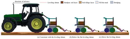Rice, as a major global food crop, relies on full mechanization of its production process as a key factor in ensuring food security and agricultural sustainable development [1,2]. Paddy field leveling is the foundation of high-yield rice cultivation. High-quality land preparation helps create a favorable seedbed and seedling bed environment for aerial seeding and mechanical transplanting operations [3,4], promotes root growth and development [3], and also serves as a prerequisite for achieving uniform irrigation and water layer management, contributing to a more coordinated water–fertilizer environment [5,6,7]. Furthermore, the land preparation process can remove weeds, incorporate crop residues from the previous season, and facilitate the thorough integration of base fertilizer with the soil, thereby improving fertilizer utilization efficiency [8].