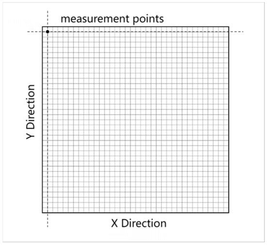 The measurement of surface levelness is based on ground elevation data. In the experiment, elevation measurement was carried out using the X15 video measurement RTK (Shanghai Huace Navigation Technology Ltd., Shanghai, China), as shown in Figure 4 below. Before the experiment, a 2 m × 2 m measurement grid comprising a total of 1296 measurement points was established in the experiment area, as shown in Figure 5. Before and after the operation, the pre-calibrated RTK rover was used to accurately measure and record the initial elevation data of all 1296 grid points point by point. The surface levelness (S) before and after the operation was then statistically analyzed and calculated using the following formula: