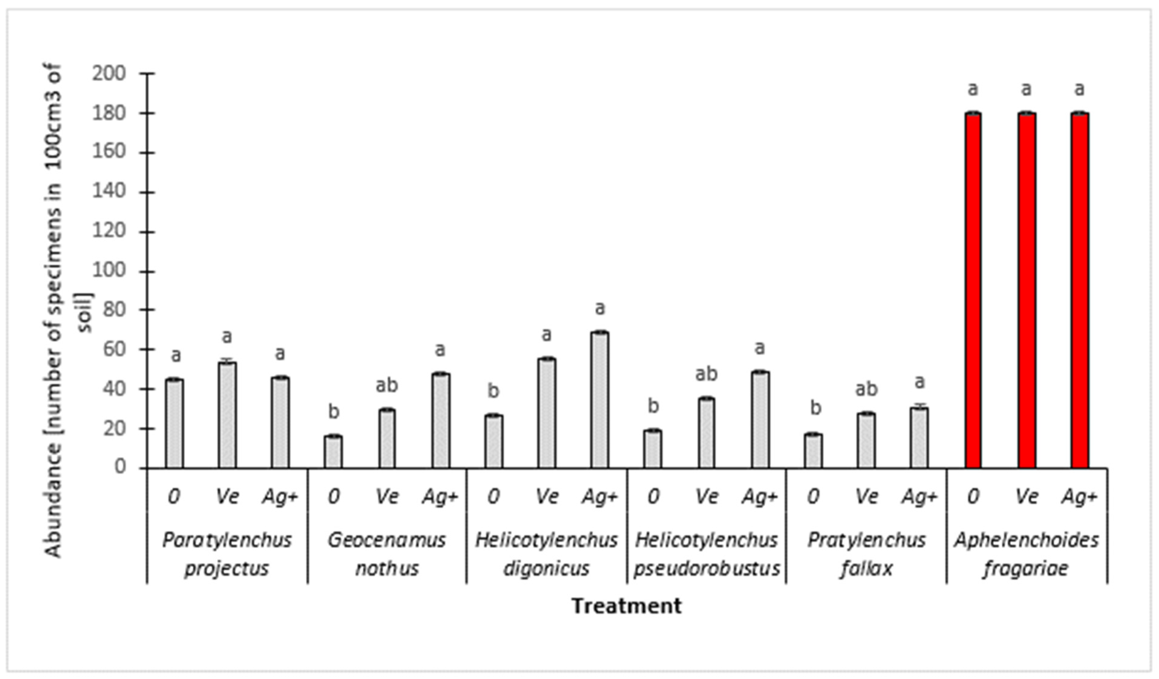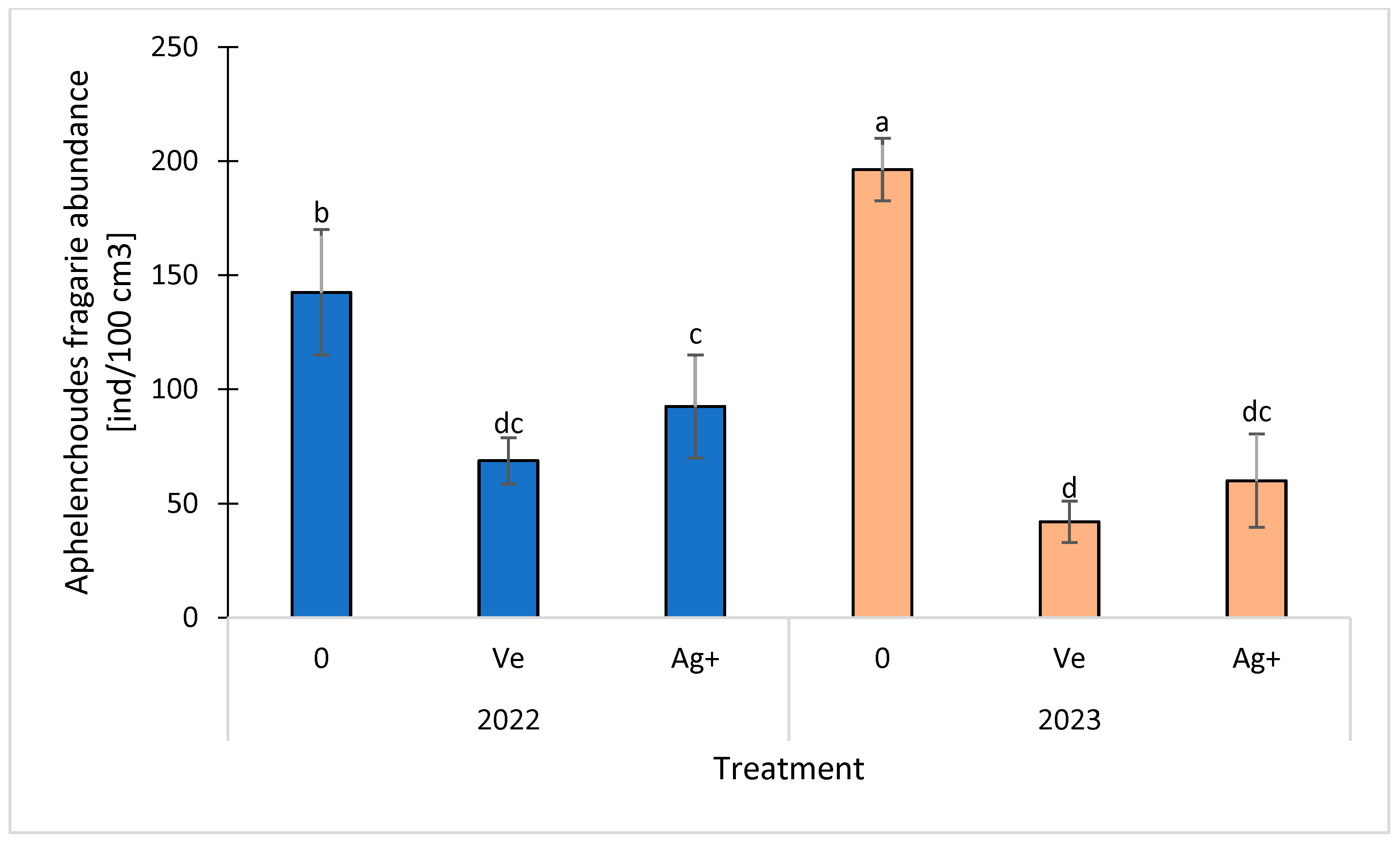 Chicago/Turabian StyleSkwiercz, Andrzej, Małgorzata Sekrecka, Aleksandra Trzewik, Anna Wawrzyniak, Tatyana Stefanovska, Anastasiia Husieva, Anita Zapałowska, and Adam Masłoń. 2025. "Effect of Soil Treatments with Vermicompost and Ag+ on Strawberry (Fragaria × Ananassa) Inoculated with the Leaf Nematode Aphelenchoides Fragariae" Agronomy 15, no. 12: 2900. https://doi.org/10.3390/agronomy15122900