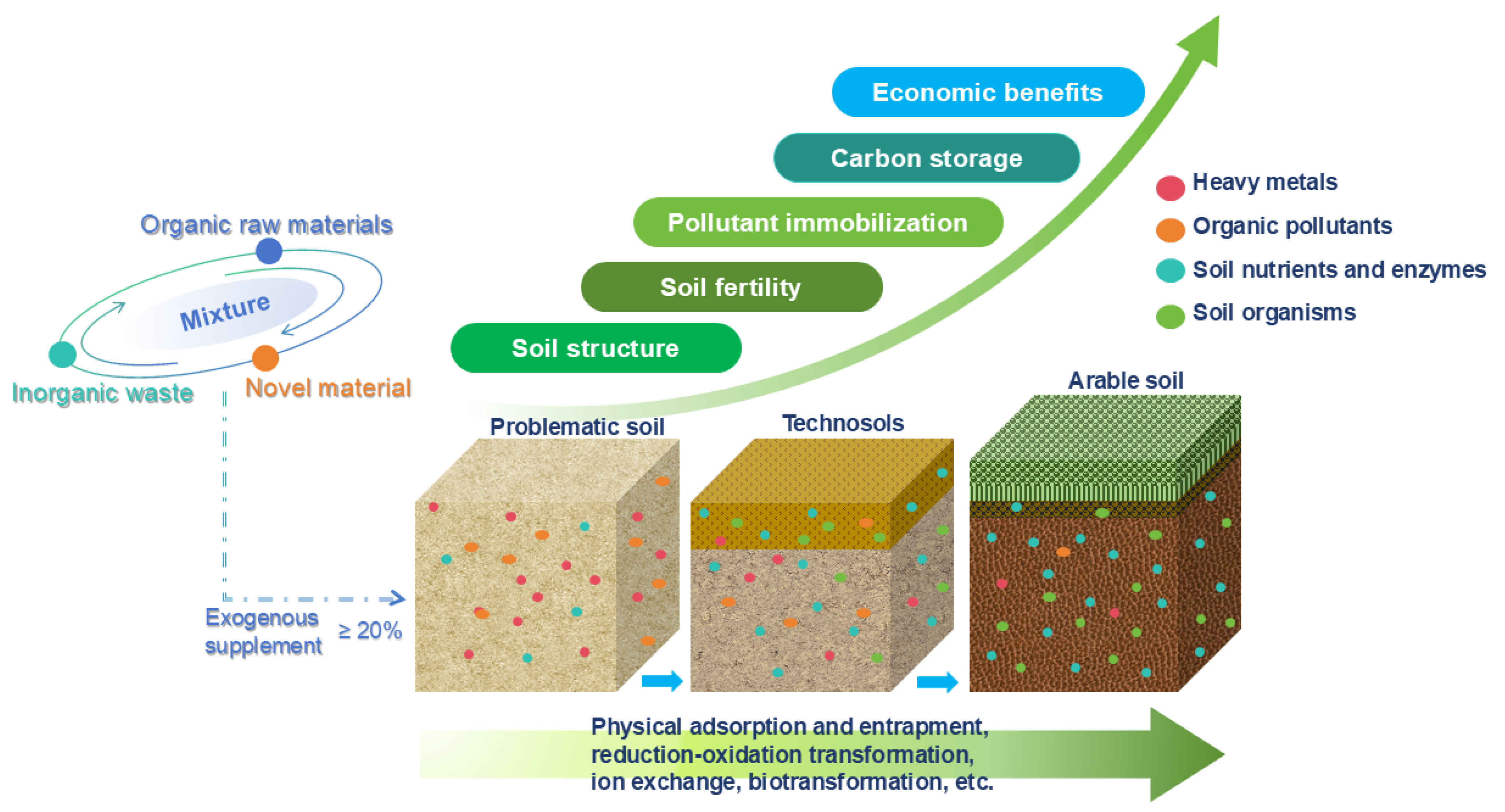 - Construction technologies and efficacy of novel nanomaterial-enhanced Technosols. Develop novel materials capable of passivating, adsorbing, or degrading pollutants to mitigate their translocation risks in soil-crop systems. Investigate the dispersion stability and mechanisms of materials like nano-hydroxyapatite and graphene in soils, focusing on their effects on nutrient release and microbial activity. Enhance nutrient retention and erosion resistance of Technosols through chemical modifications. Explore stimuli-responsive materials (e.g., thermo-/photo-sensitive hydrogels, shape-memory polymers) for adaptive regulation of soil aeration and water retention. Design stratified functional systems for Technosols with surface evaporation suppression, rhizosphere microbiome activation, and deep-layer pollutant immobilization. The environmental application of nanomaterials must address two intertwined challenges: their potential mobility in porous soils and the difficulty of achieving uniform dispersion at scale. In sandy or highly permeable soils, nanoparticles risk leaching or uptake by biota. This could be mitigated by immobilization strategies such as surface functionalization for strong soil binding, encapsulation within stable matrices (e.g., biochar), or in situ synthesis to create fixed reactive sites. Concurrently, the pursuit of perfect pore-scale homogeneity is being replaced by pragmatic delivery methods for functional efficacy. These include using granular composite carriers for mechanical spreading, creating targeted treatment zones (e.g., reactive barriers), and employing improved mixing techniques to ensure predictable nanoparticle performance in field-scale applications without requiring uniform dispersion.