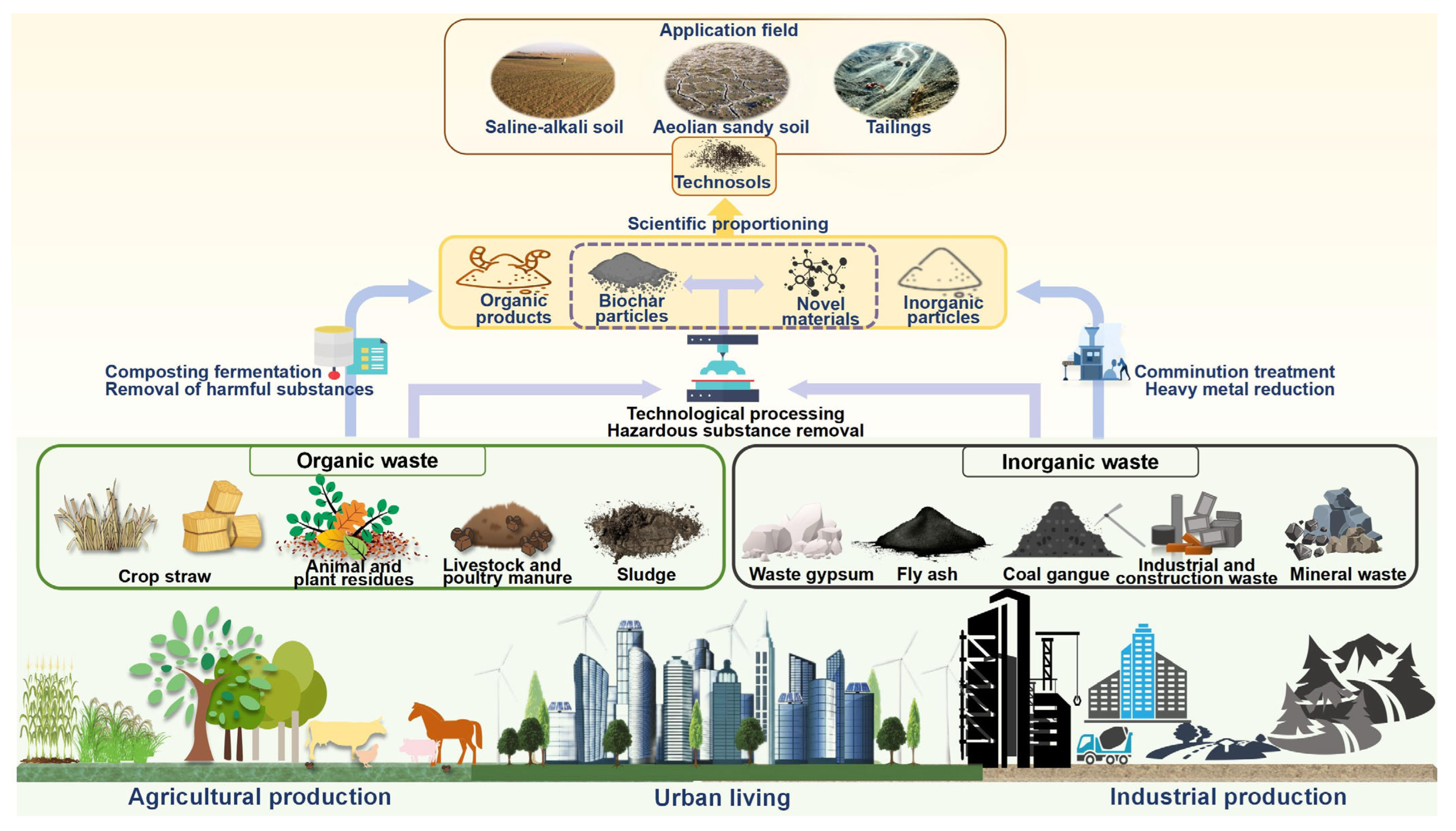 - Targeted design of Technosols for agricultural applications. Conduct systematic research on the agricultural suitability of diverse waste materials. Develop targeted Technosols formulations to address specific soil issues (e.g., nutrient deficiency, heavy metal/organic pollution, salinization) and application contexts (e.g., tailings reclamation, desert restoration, urban soil rehabilitation). Optimize raw material pretreatment and mixing ratios to balance nutrient supply and soil physical structure [102]. Integrate techniques such as straw incorporation, green manure cultivation, and humic-promoting agents to shorten soil maturation cycles. Establish a coordinated “urban-industrial-agricultural” waste utilization chain, promote standardization of Technosols in agriculture, and formulate supportive policies to enhance ecological compensation and land restoration incentives.