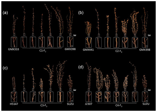 Representative individuals from four segregating populations and parental varieties. (a) C1-F2; (b) C2-F2; (c) C3-F3; (d) C4-F3. Insets show enlarged views of the stem base.
