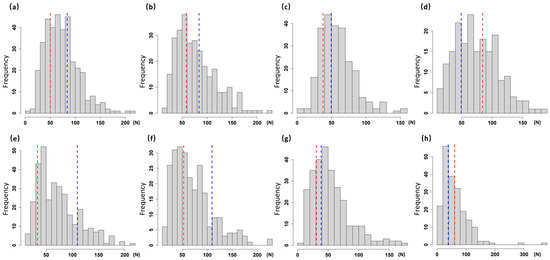 Frequency distribution of stem strength in eight populations. (a) C1-F2; (b) C2-F2; (c) C3-F2; (d) C4-F2; (e) C1-F3; (f) C2-F3; (g) C3-F3; (h) C4-F3; red and blue dashed lines represent maternal and paternal mean values.