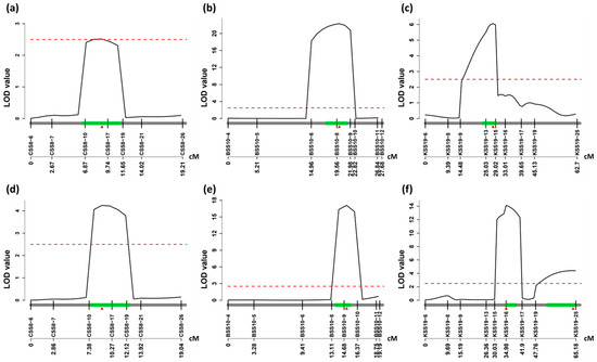 Linkage mapping of the qSS8, qSS10 and qSS19-2 loci. (a) QTL mapping of qSS8 in C2-F2. (b) QTL mapping of qSS10 in C1-F2. (c) QTL mapping of qSS19-2 in C4-F2. (d) QTL mapping of qSS8 in C2-F3. (e) QTL mapping of qSS10 in C1-F3. (f) QTL mapping of qSS19-2 in C4-F3. The red dashed line represents the LOD threshold (LOD = 2.5). Red triangles indicate the peak positions of the QTLs, and green segments represent the 95% confidence intervals.