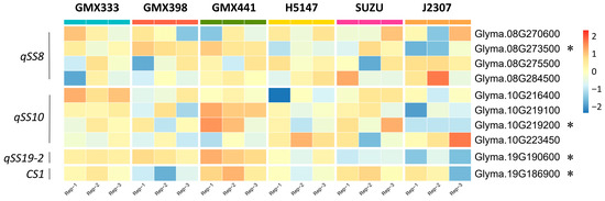 Additionally, we analyzed sequence variation among parental varieties based on whole-genome resequencing data. Most sequence variants were located in untranslated regions (UTRs), introns, and upstream or downstream regulatory regions of the candidate genes (Table 3). Notably, in the qSS8 region, we identified a missense variant in Glyma.08G273500 between the two parental varieties of C2, from which the QTL was derived. The variant was predicted to be tolerated with a SIFT score of 0.51 (https://sift.bii.a-star.edu.sg/, accessed on 10 December 2025). In the qSS19-2 region, Glyma.19G195200 exhibited a start codon loss and a conserved in-frame deletion between the parental varieties of C3, suggesting high functional disruption.