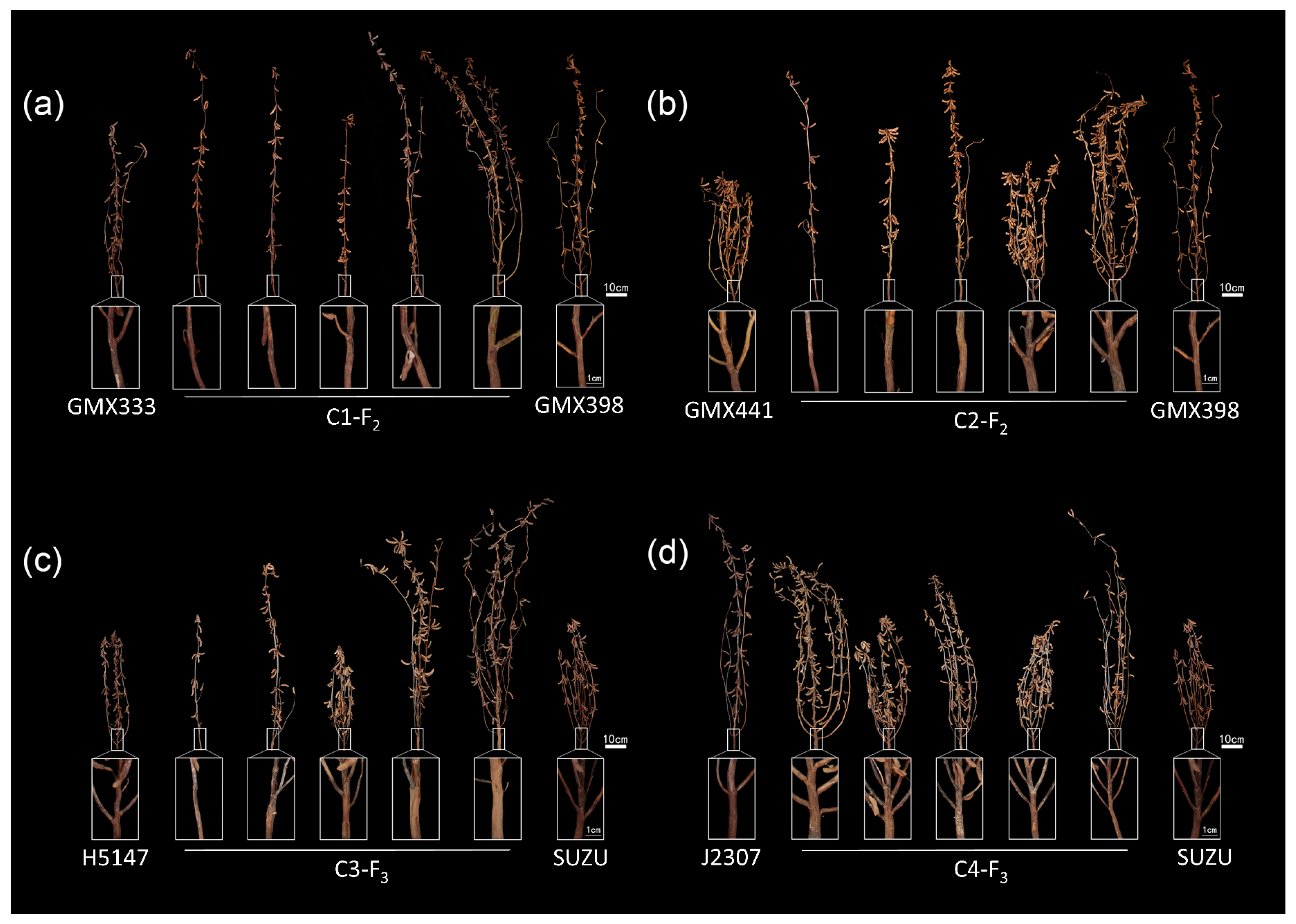 - Liu, L.; Cao, H.; Yao, H.; Zhuang, Y.; Chen, B.; Zhang, C.; Li, X.; Zhang, D. Identification of a major QTL and its candidate genes controlling stem strength in soybean via QTL mapping and GWAS. Crop J. 2025, in press. [Google Scholar] [CrossRef]