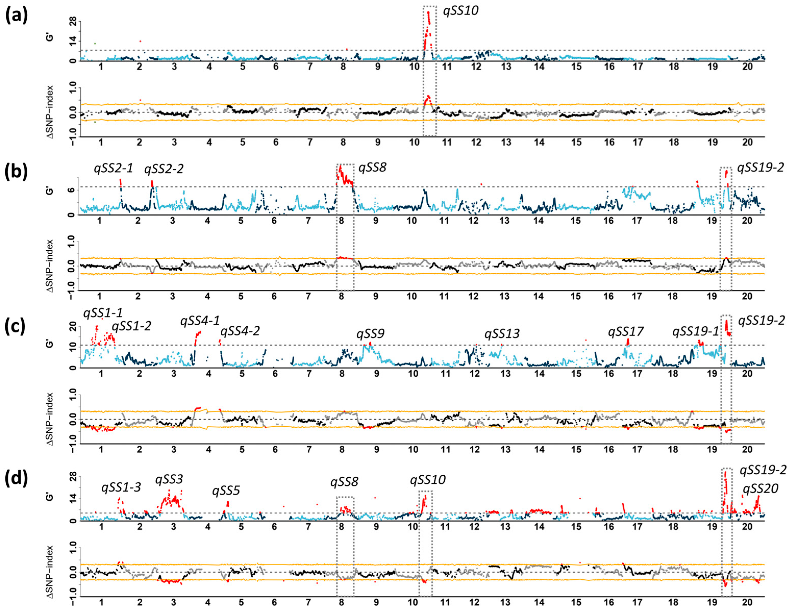| qSS20 | Chr20 | 35.87–40.82 | 15.80 | 2.43 × 10−4 | 0.44 | C4:F3 | SUZU |