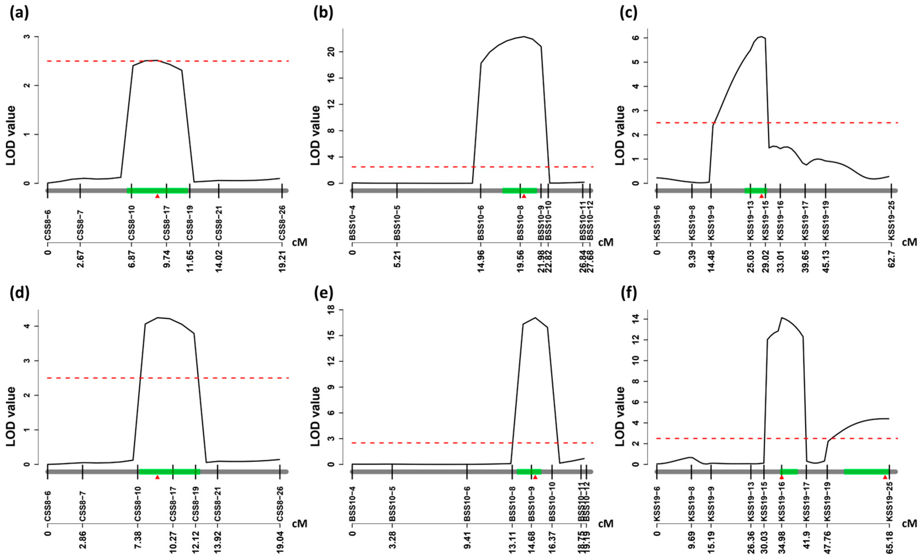 | qSS8 | 8 | 34,203,399–38,888,594 | 2.51 | 5.66 | CSS8-10 | CSS8-17 | C2-F2/284 | 19.21 | GMX398 |