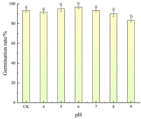 Effect of pH on the germination of A. indica seeds. Germination rate (%) was recorded after 15 d. Vertical bars represent ± standard error of the mean. Bars with different letters are significantly different at p < 0.05 according to Duncan’s multiple range test.