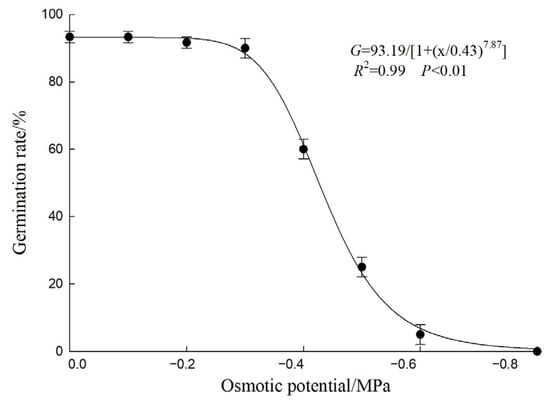 Effect of Osmotic potential on the germination of A. indica seeds. Germination rate (%) was recorded after 15 d. Points represent the mean, and vertical bars represent ± standard error of the mean. The curve was fitted using a three-parameter logistic model (Equation (2)).