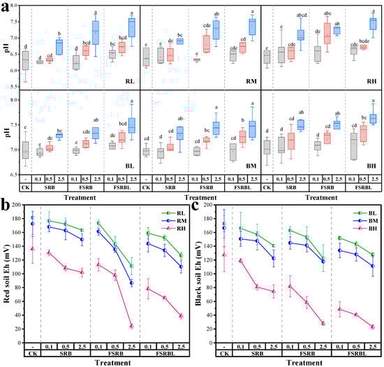Overall comparison of soil pH values (a) under different biochar treatments in different contaminated red soils and black soils within the range of 0–50 days (Samples were collected six times on days 5, 10, 20, 30, 40, and 50, with three replicates per collection, resulting in a total sample size of n = 18.), and soil Eh values on the 50th day incubation (n = 3) (b,c). Error bars represent standard deviation, and different lowercase letters indicate statistically significant differences among treatments (p < 0.05, Duncan’s test).
